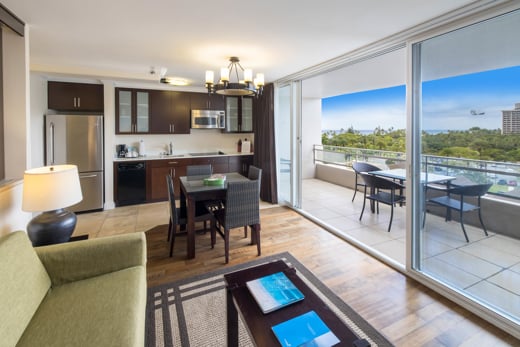Zimmer mit Verbindungstür und Einheiten mit einem Schlafzimmer und Küchenzeile. In der Nähe des Waikiki Beach Walk, des International Market Place und des Strandes.